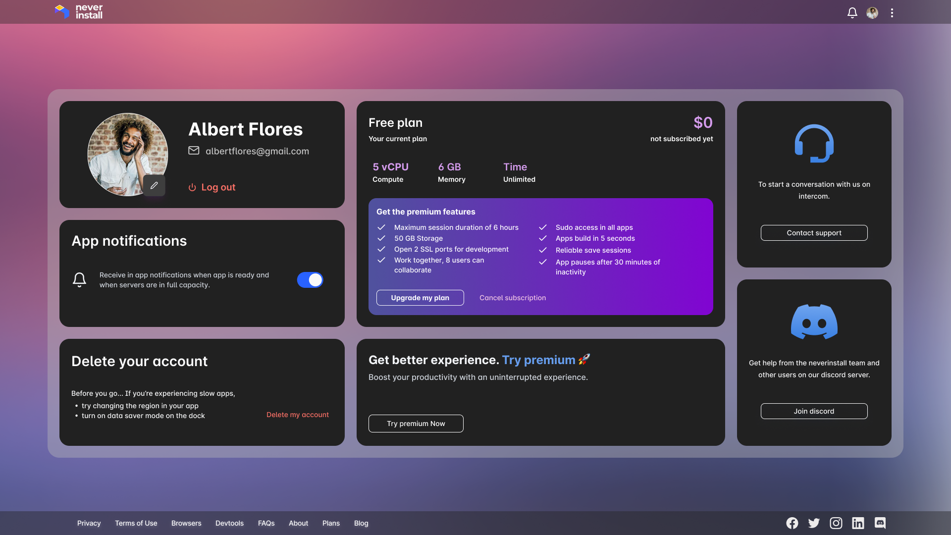 All users see their current plan details in the middle of the profile page. The profile page contains all the details including the date of purchase of a plan, the cost, the resources, and the features available with the current plan.